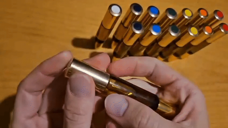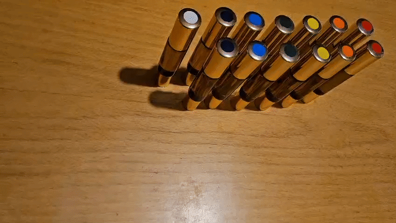 Das sind die 7 Chakra Perfumes Stifte welche auf der einen Seite einen Sprühkopf haben und auf der anderen Seite einen Rollkopf.